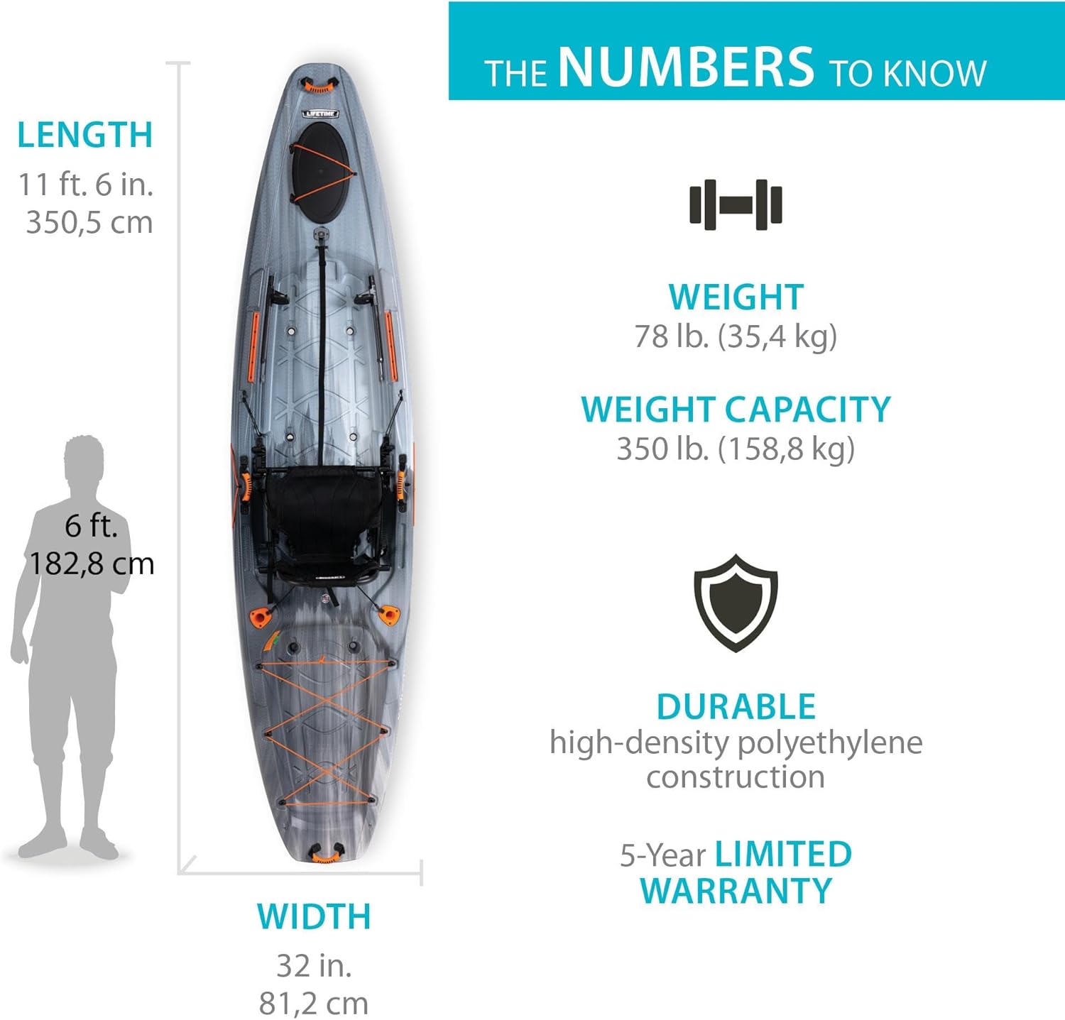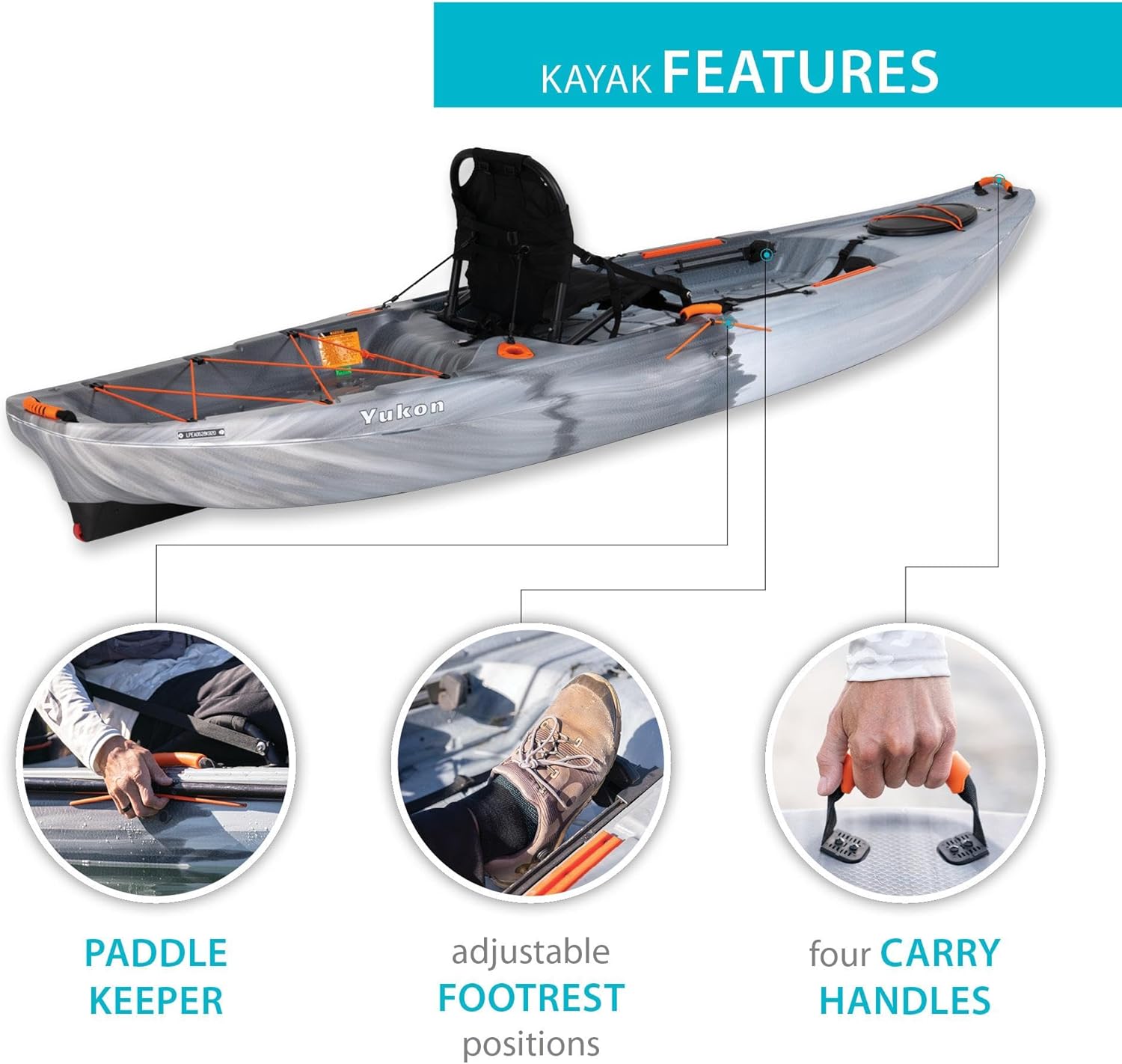 The Lifetime Yukon Fishing Kayak will take you on many fishing adventures through lakes, reservoirs, and rivers. The kayak comes with plenty of features and extras to ensure you have a comfortable, successful trip. Designed with triple fishing rod holders, integrated accessory mounts, tankwell storage, and bungee straps, you have room for all your fishing gear and your catches. The stable hull was designed for balance and allows you to cast while standing up. The adjustable foot braces let you maximize your comfort while on the water. Conveniently carry your kayak to and from the water with the luggage-style handles. The Lifetime Yukon Fishing Kayak will meet all your fishing needs!