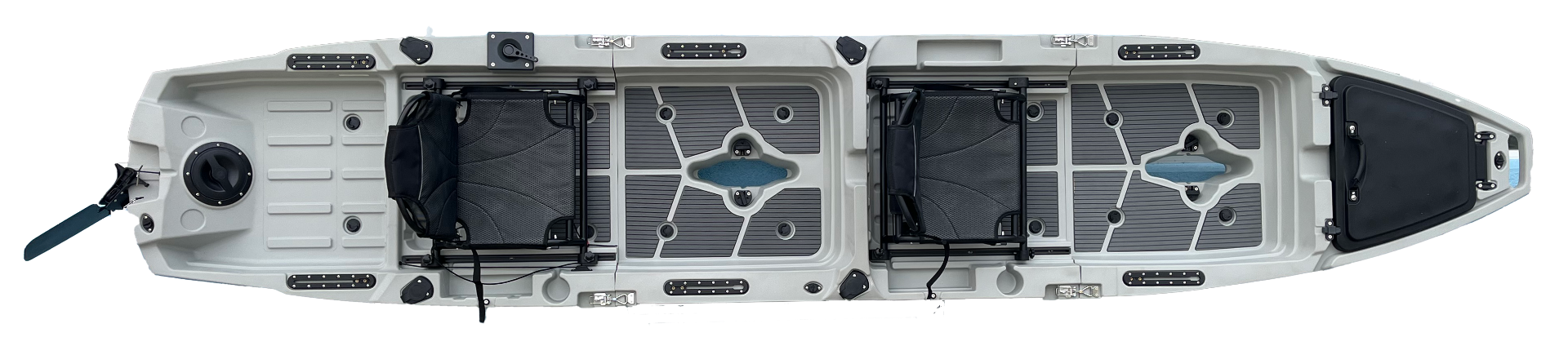 All the stability and tracking of a rotomolded kayak, but with the convenience and storage capabilities of an inflatable – that’s what the all-new Modular Pedal Fish brings to the table! Two separately molded halves of one hull are easy to click together for a solid, stable platform, and even easier to disassemble for easier transport and storage. Includes a stern storage compartment with bungee, a stowable rudder, aluminum framed seat, in-hull storage, paddle keep, gear tracks, and a flipper-propelled pedal drive.